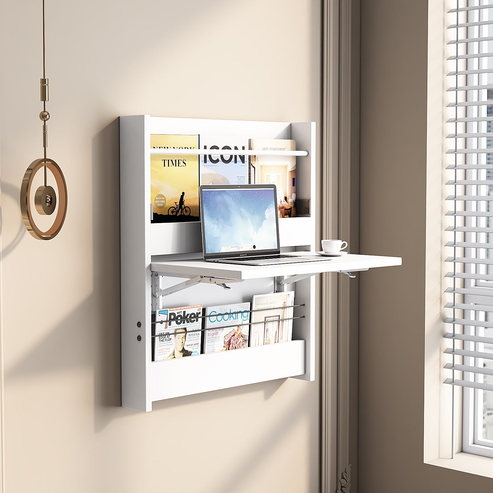 - 【Storage Shelves】Great design wall mounted desk with storage shelves provides working space and extra plenty of storage space, for you to place or lay aside your daily things and optimizes your space & empties the floor for easy cleaning.Hiden cable and wire management keeps your desk organized. Spacious side compartments to store books, photographs and other personal items.