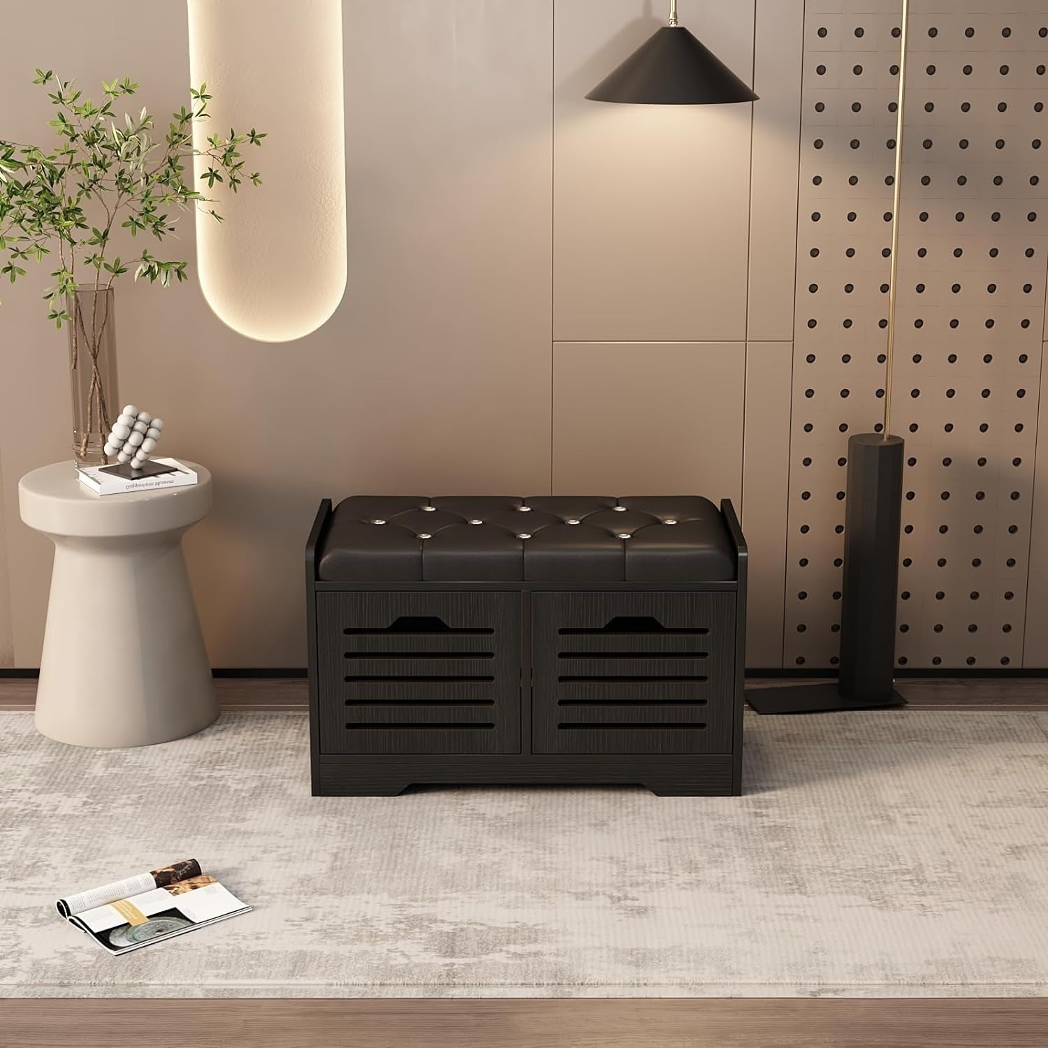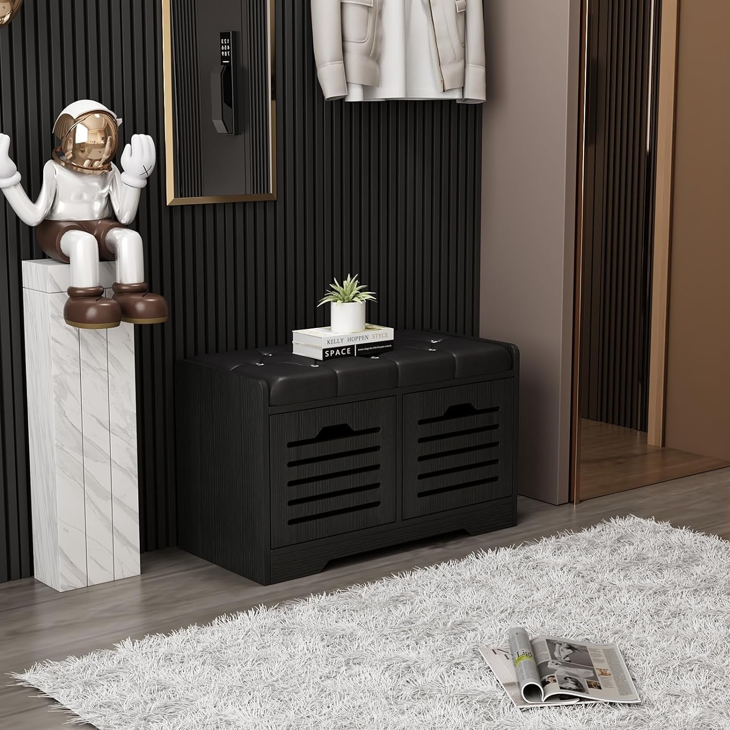 - 【Louvered Doors】This storage bench is ventilated through the louvered doors to stop those smelly shoe odors that can often build up inside. A neutral colormatching plus louvered design door will add stylish storage and look to your home.